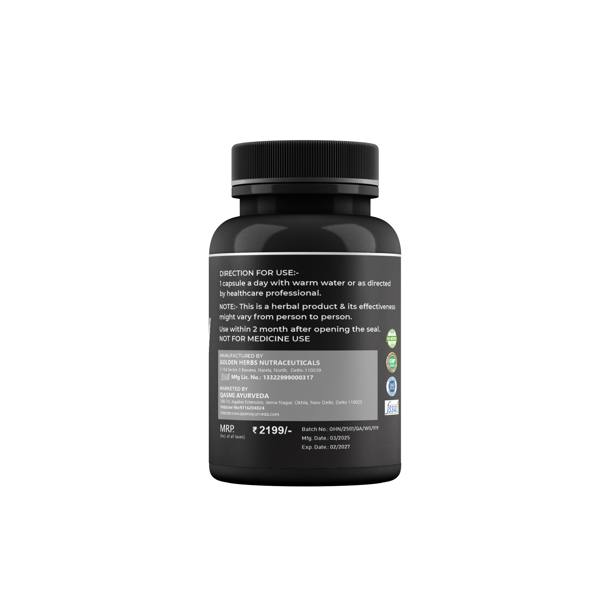 Soybean-50mg, Rajma-25mg, Jai-25mg, Khuskhas-25mg, Moongfali-25mg, Chaulai, Masoor-25mg, Kaunch Beej-20mg, Gheekwar-20mg, Safed Moosli-20mg, Karela-10mg, Arjun-10mg, Chob Cheeni-10mg, Kusum-10mg, Narangi ka chilka-10mg, Asghand-10mg, Chirayta-10mg, Bidari-10mg, Aksrkara-10mg, Sonth-10mg, Giloy-10mg, Manjishtha-10mg, Saunf, Gullab ka phool-05mg, Jeyfal-05mg, Shilajeet-05mg, Zaitoon-03mg, long-03mg